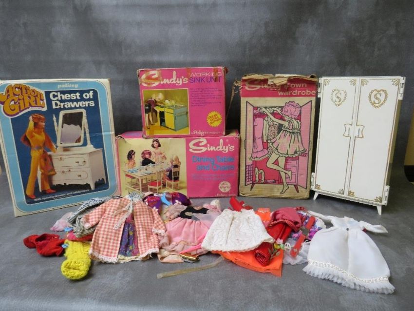 BOXED VINTAGE SINDY TOYS. to include wardrobe, table & chairs and working sink unit, together with a boxed Palitoy Action Girl chest of drawers, boxes A/F and a collection of Sindy dolls clothes