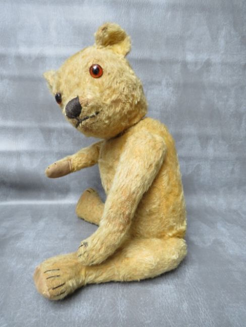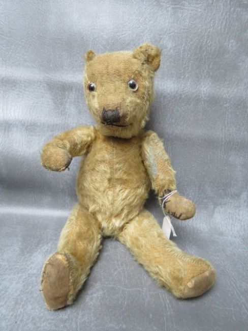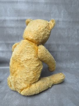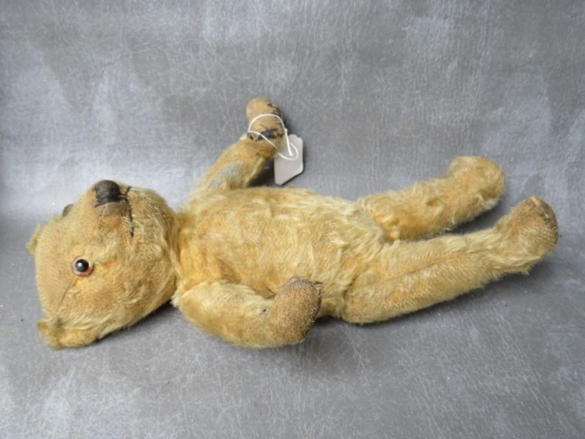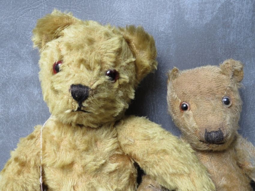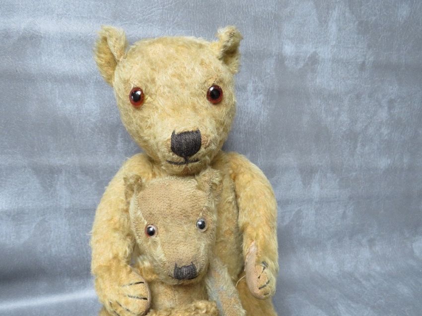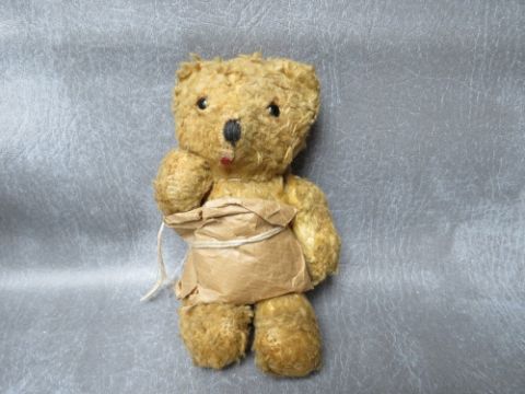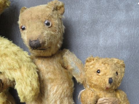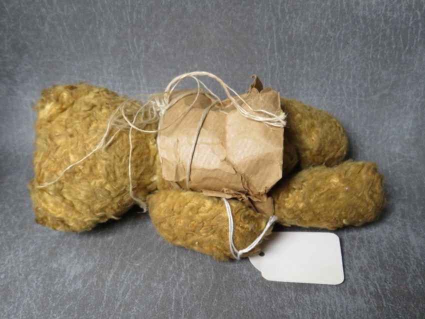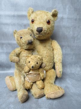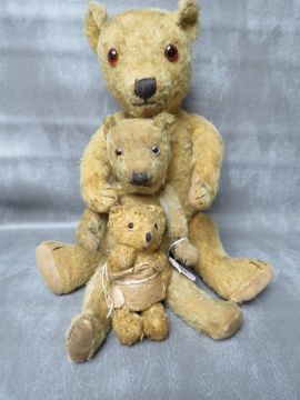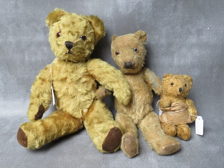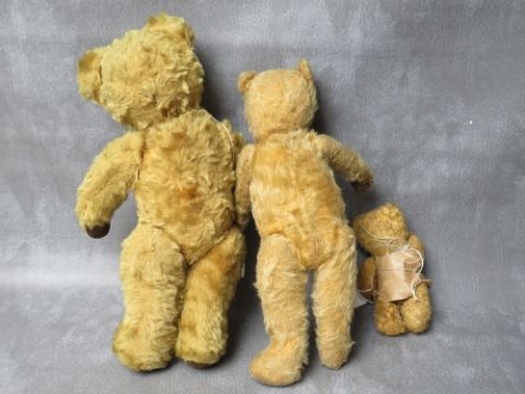A FAMILY OF THREE VINTAGE TEDDY BEARS, the tallest bear approx. H 54 cm, early 20th century straw filled, fully jointed with hump back, medium bear approx. H 36 cm, smallest bear approx. H 17 cm wrapped in dress style brown paper tied up with string
