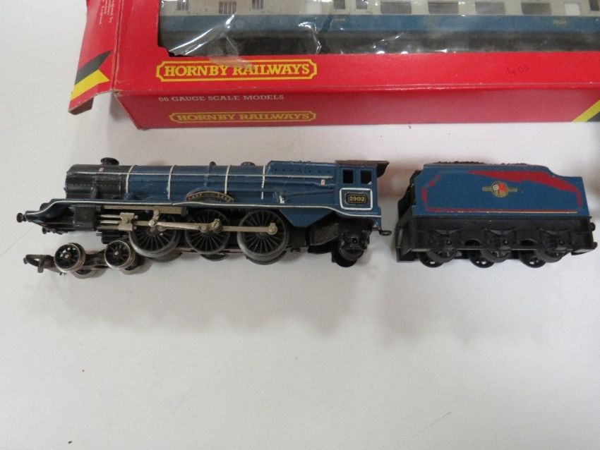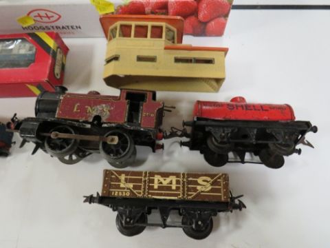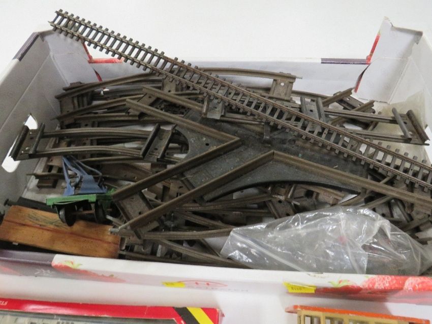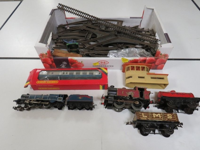 AN UNBOXED 00 GAUGE LADY OF THE LAKE TRIANG STEAM LOCOMOTIVE & TENDER 4-6-2, boxed Hornby 00 gauge carriage, clockwork 0 gauge LMS locomotive 2270 and two pieces of rolling stock, together with a box of mainly 0 gauge track