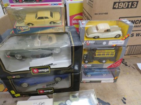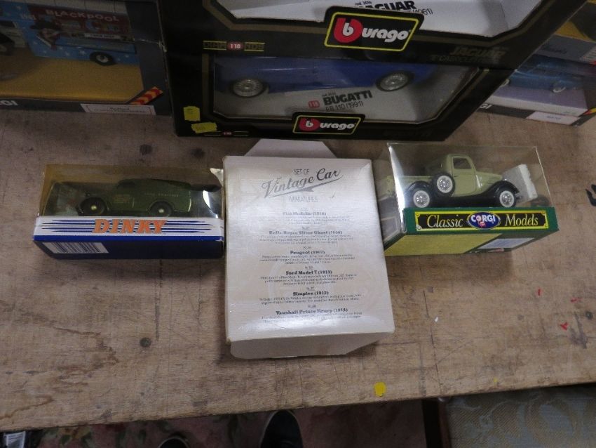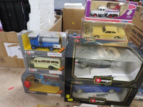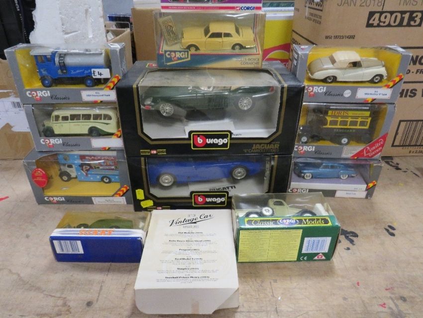 TWO BOXED BURAGO 1:18 SCALE CARS, 1991 Bugatti and 1961 Jaguar, both boxes A/F, six boxed Corgi Classic vehicles, boxed Corgi Rolls Royce corniche, boxed Corgi Trackside BRS wrecker etc