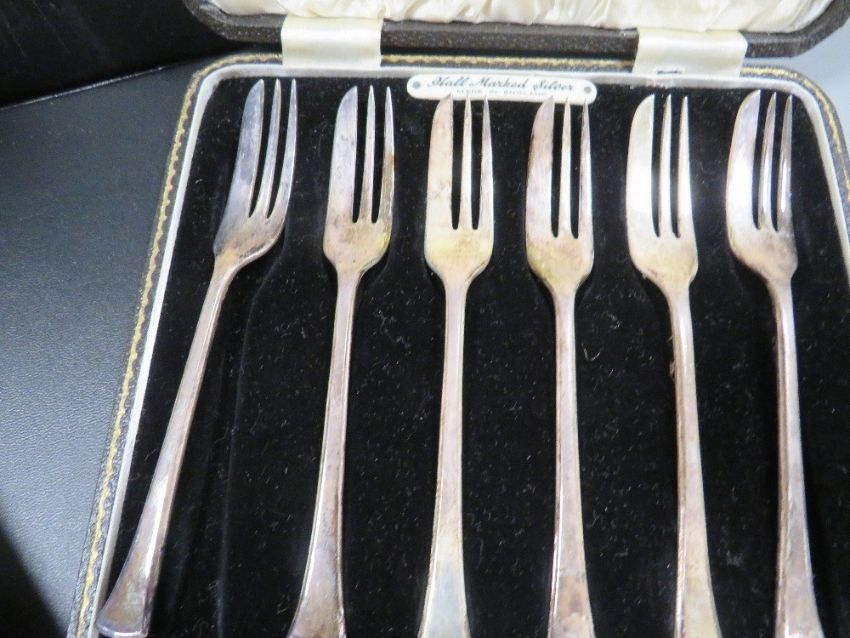 A cased hallmarked silver egg cup & spoon gift set together with a cased set of hallmarked silver cake forks