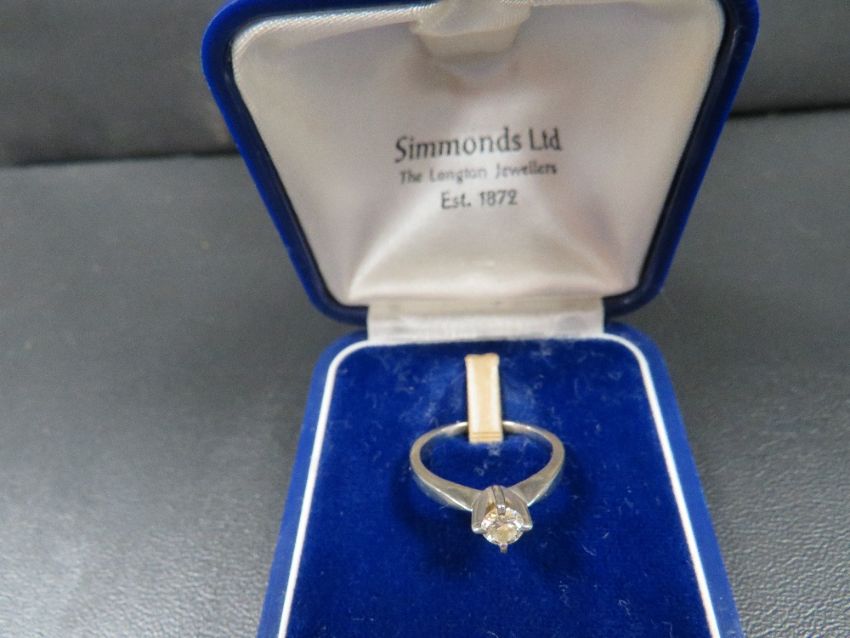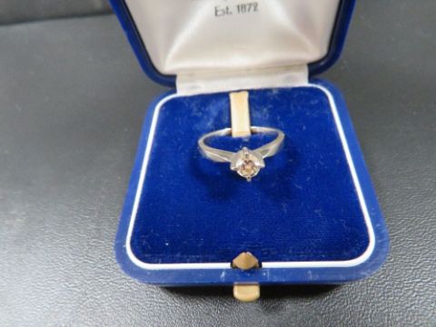 An 18ct white metal four claw set diamond solitaire ring (diamond showing colour and inclusions to the naked eye ) estimate 0.15ct approx. weight 2.9g