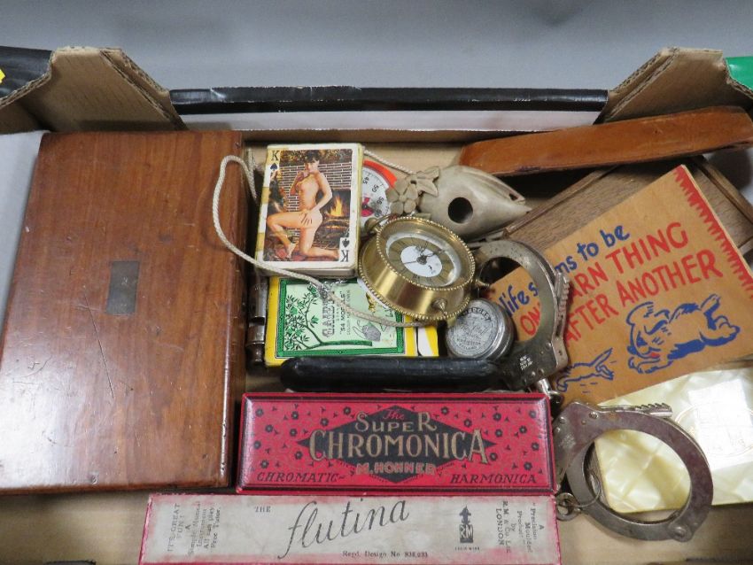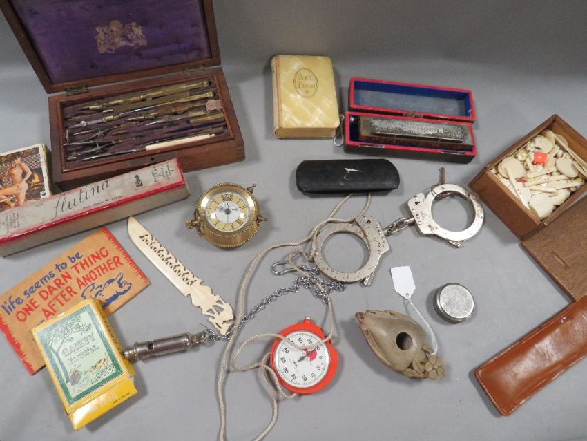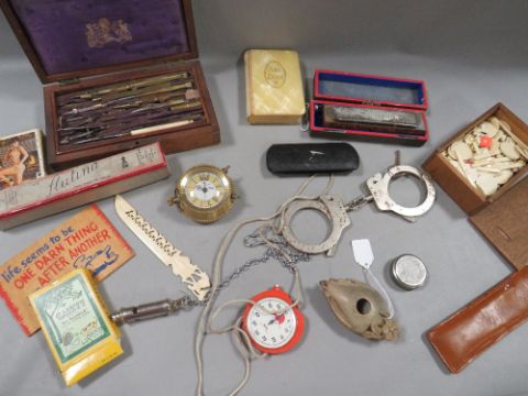 A tray of assorted collectables to include vintage handcuffs, playing cards, cased instrument set, spectacles etc.