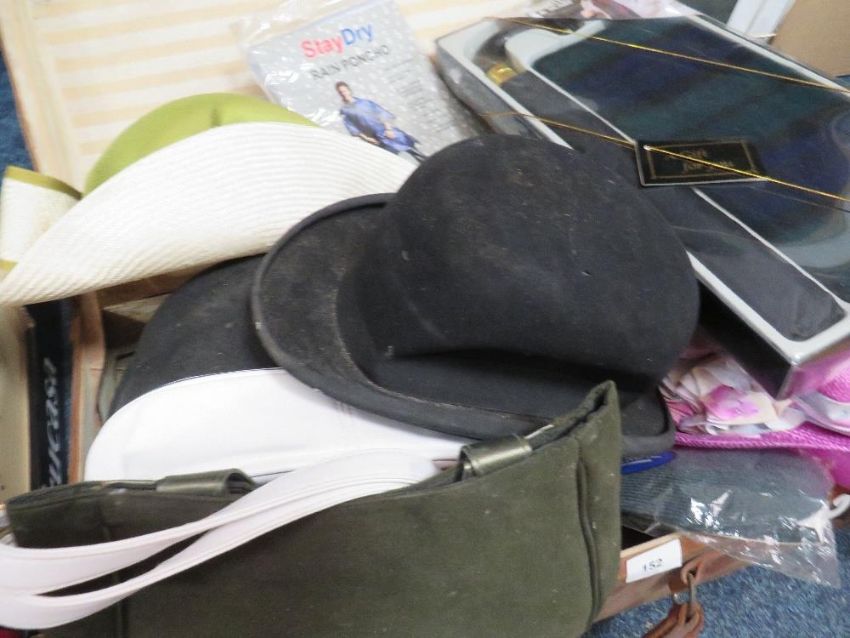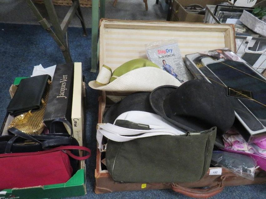 A vintage suitcase containing hats, bags and accessories