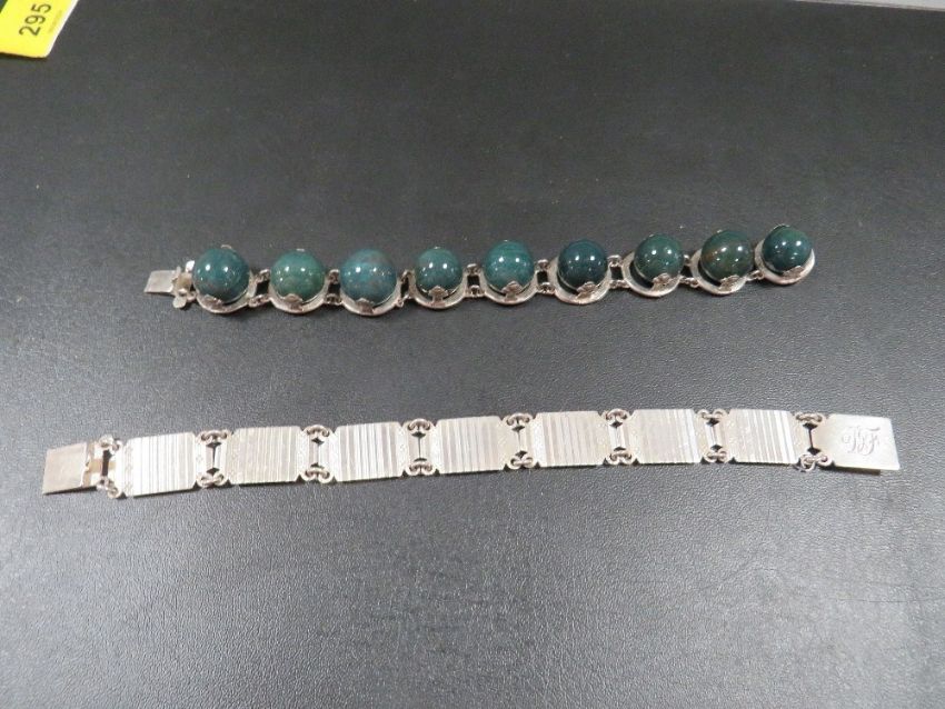 An Art Deco style silver panel link bracelet engraved with initials to central panel, together with an unusual white metal and bloodstone set bracelet - the circular panel links set with individual polished circular bloodstone rotating beads (2)