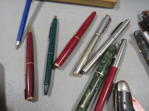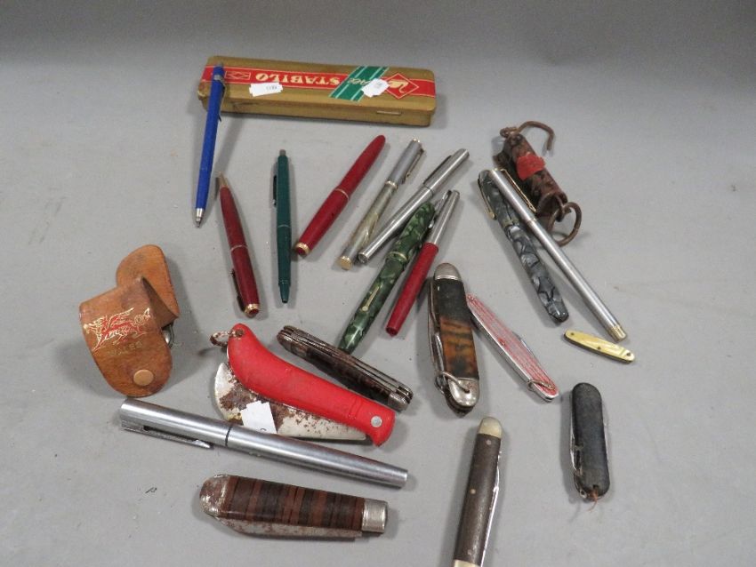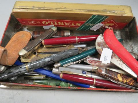 A tray of collectables to include penknife's and pens