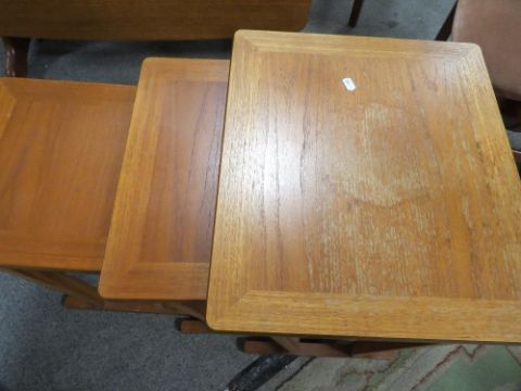 A teak dropleaf dining table and two carver dining chairs together with a retro Parker Knoll nest of three tables
