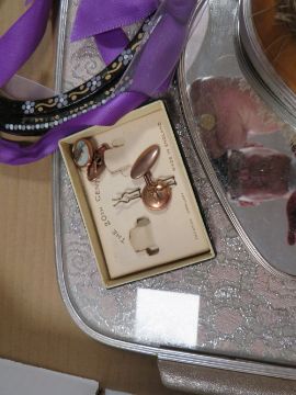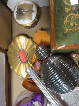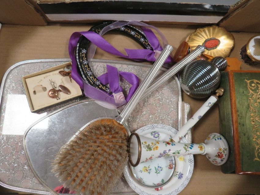 A tray of assorted collectables to include a dressing table set, vintage Kigi compact with inset coral panel, cufflinks, Halcyon Days enamel vase, tray and magnifying glass, music box etc.,