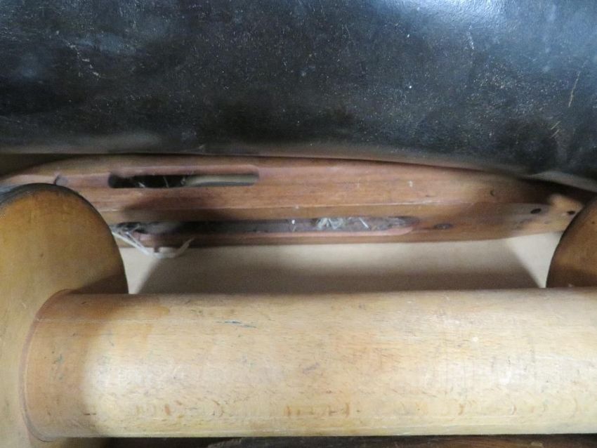 A pair of black leather riding boots with boot lasts, loom shuttle etc