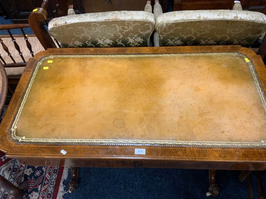 A Victorian walnut and inlaid two drawer leather top library table with nicely carved supports and stretcher H 71 cm W 114 cm
