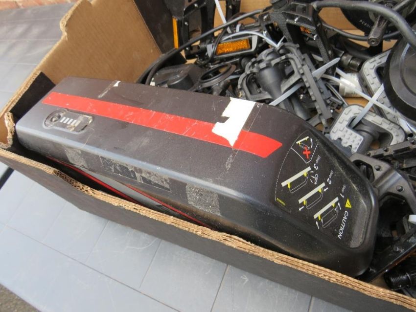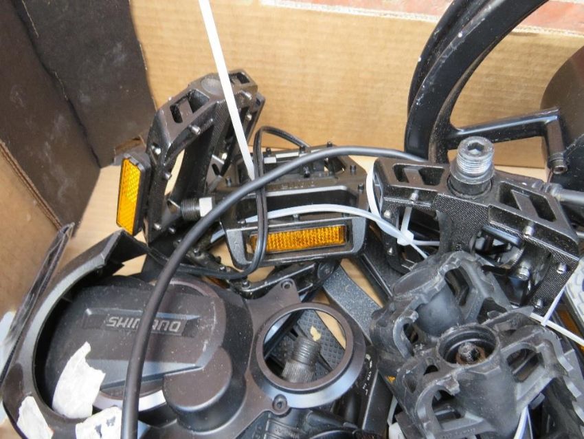A tray of new and used electric bike and other cycle parts etc