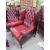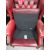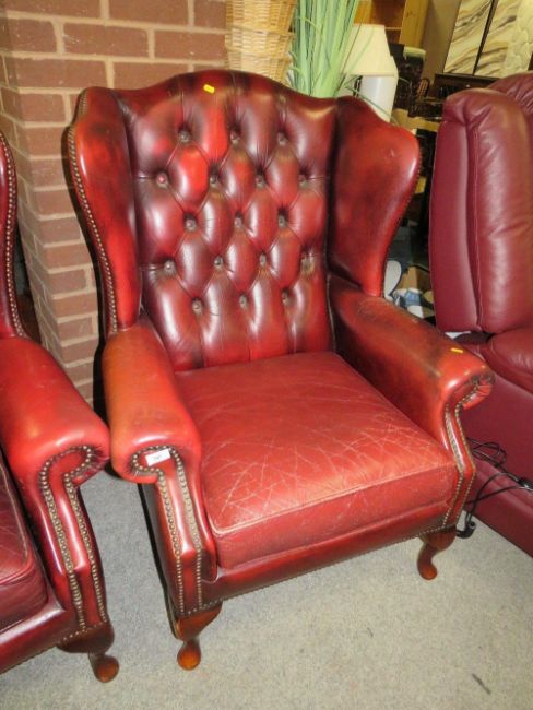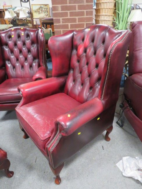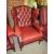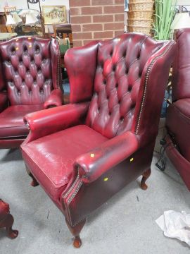 An oxblood red leather chesterfield style wing back armchair