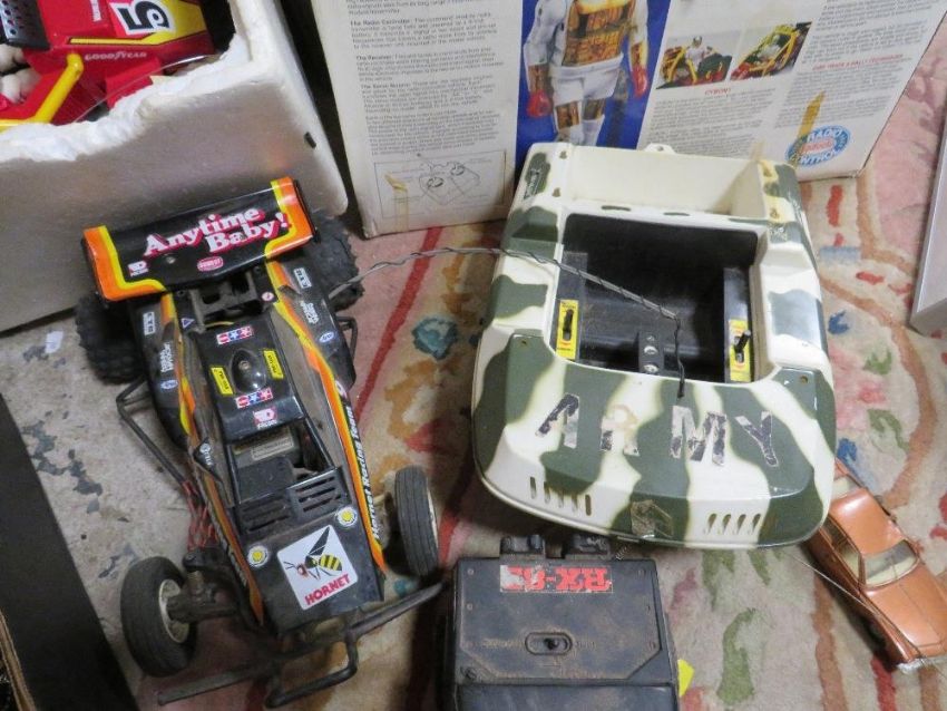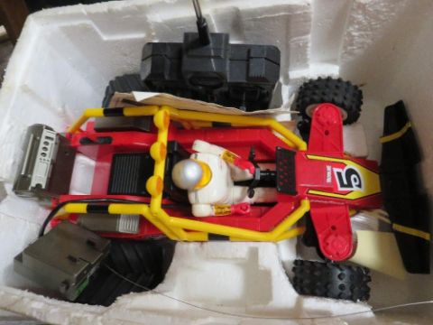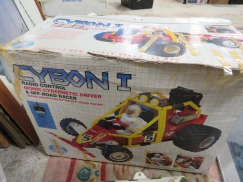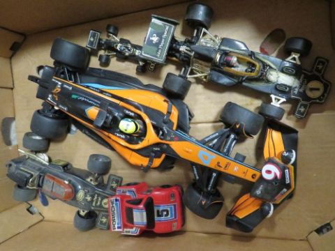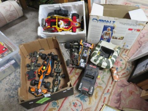 A tray of remote control cars, Formula 1 cars and a boxed Cybon 1 Bionic Cybernetic driver set