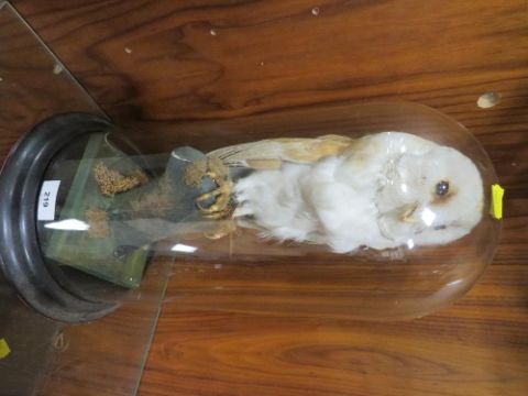 A glass dome cased taxidermy study of a barn owl with a dragonfly