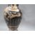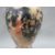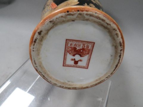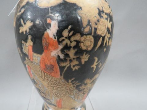 A small Oriental vase with black ground Japanese style script panels with three toed dragon above, central design of lady crossing a bridge , figurative mark to base with five character mark below
