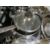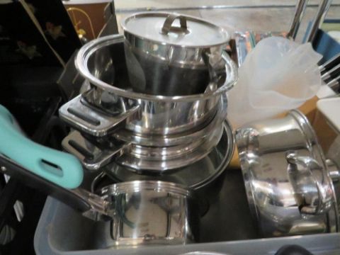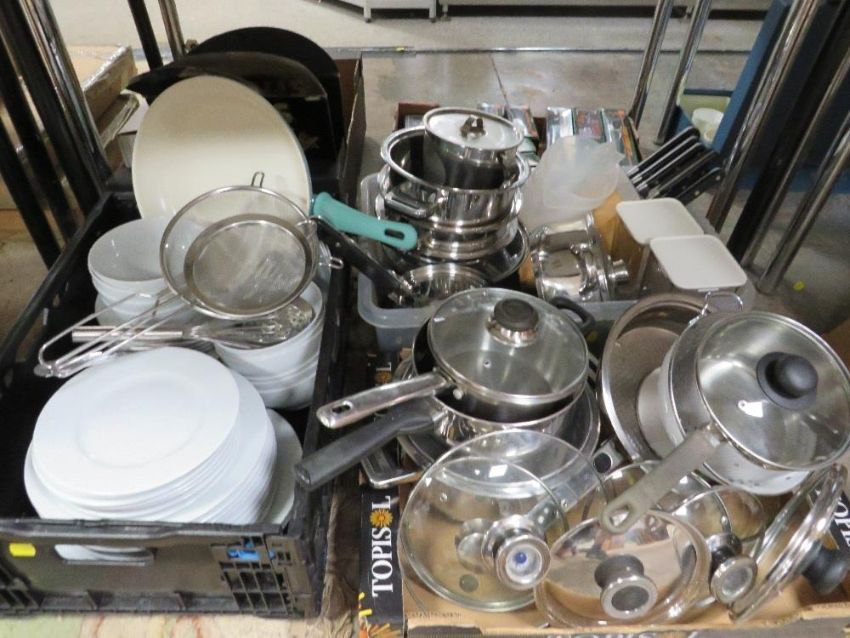 Three trays of kitchenalia to include stainless steel pans, knife block etc