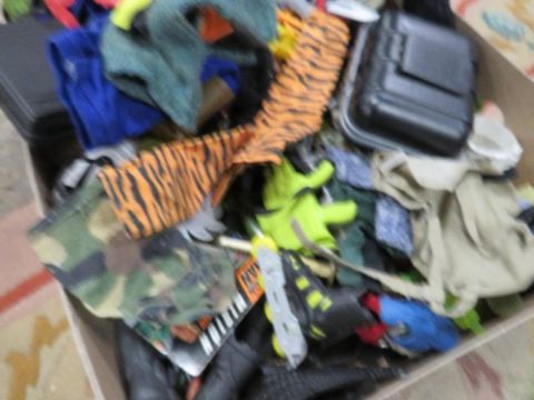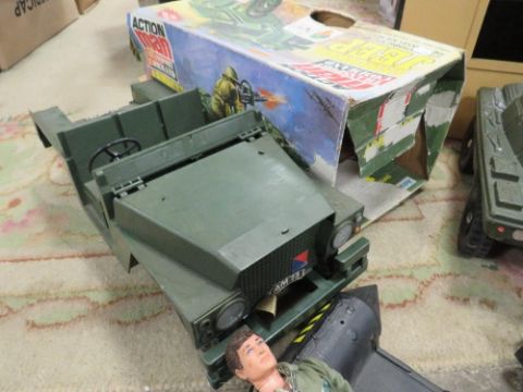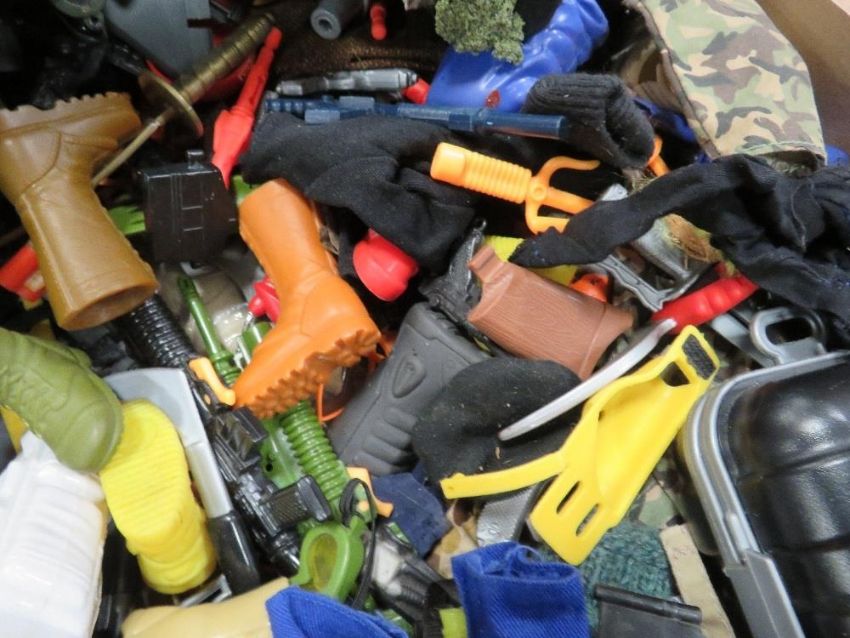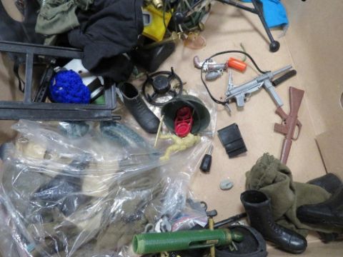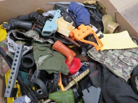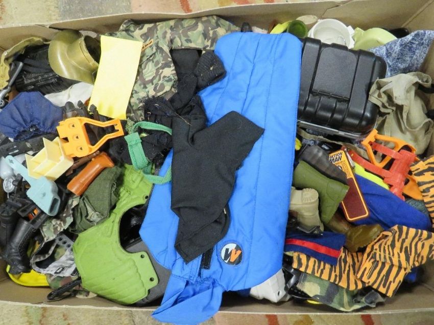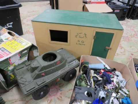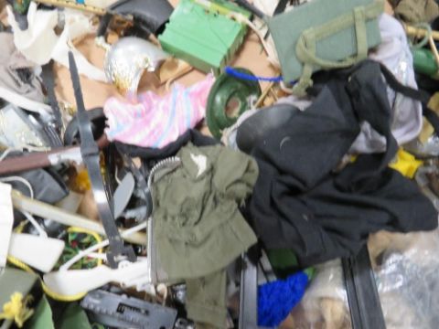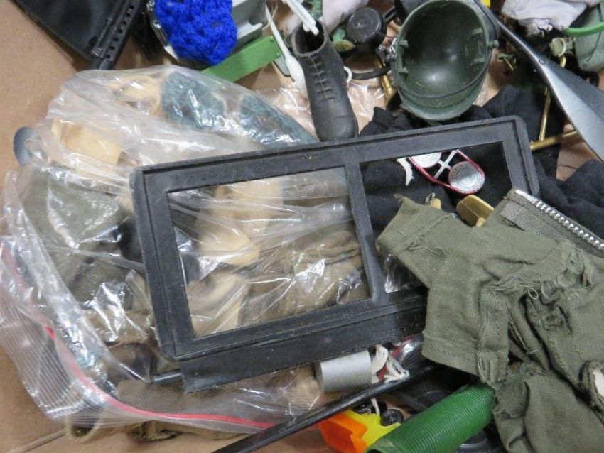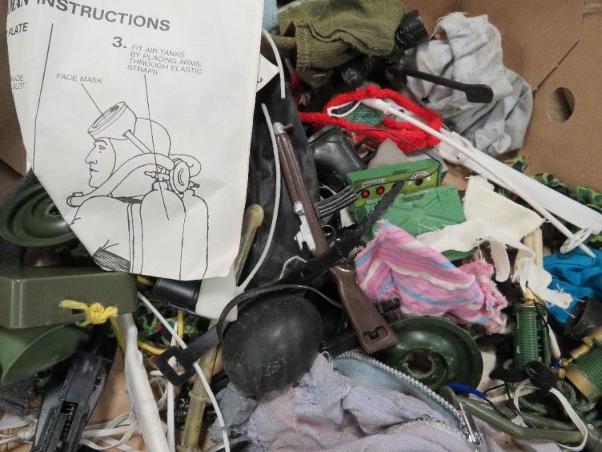A selection of vintage Action man items to include Action Man, vehicles home made hut, a large selection of vintage Action Man accessories and a large selection of modern Action Man accessories