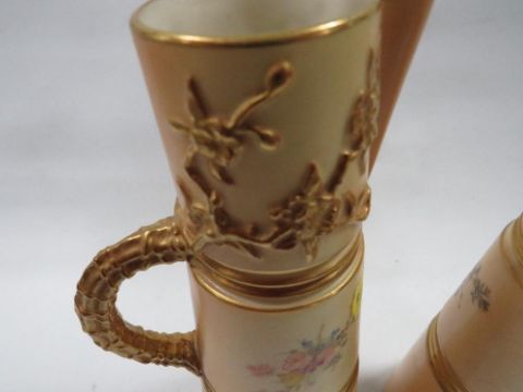 A pair of Royal Worcester blush ivory graduating jugs with gilded handles