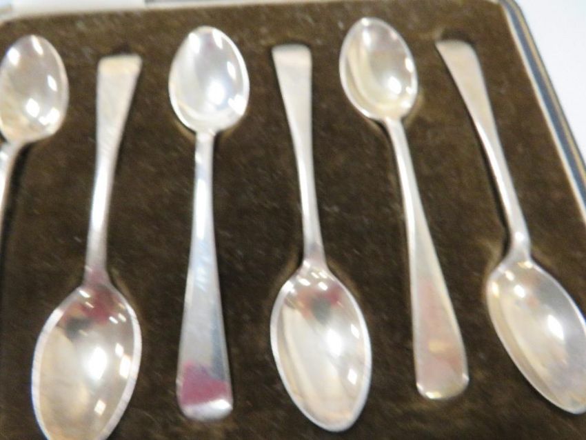 A cased set of silver hallmarked tea spoons together with another selection of spoons