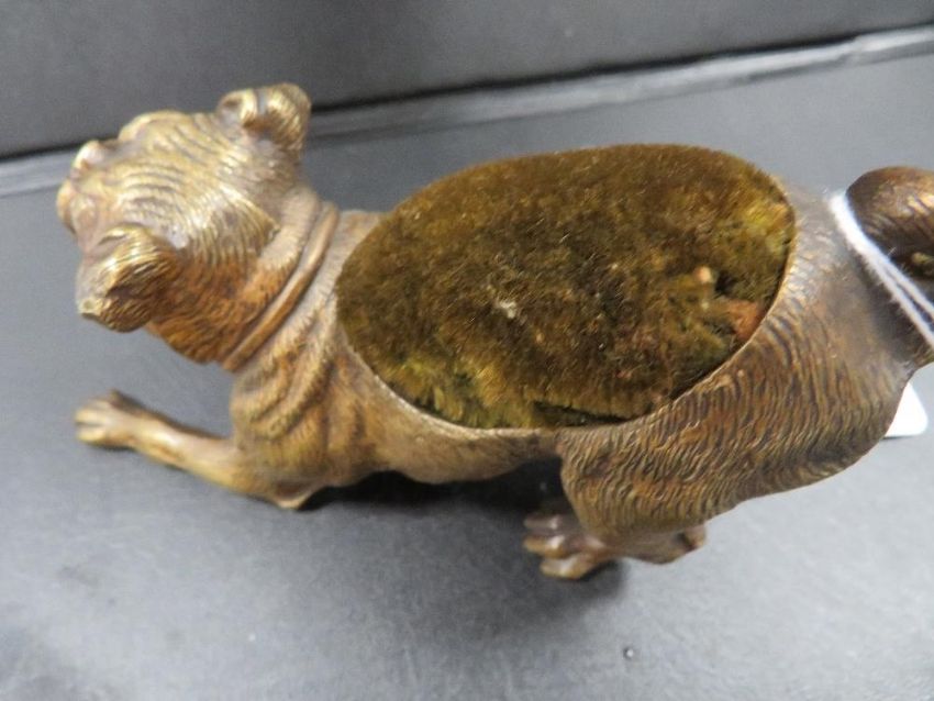 A novelty gilt metal pin cushion in the form of a pug type dog