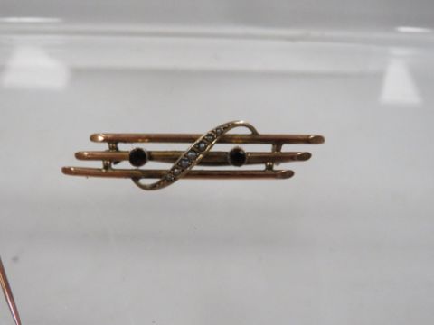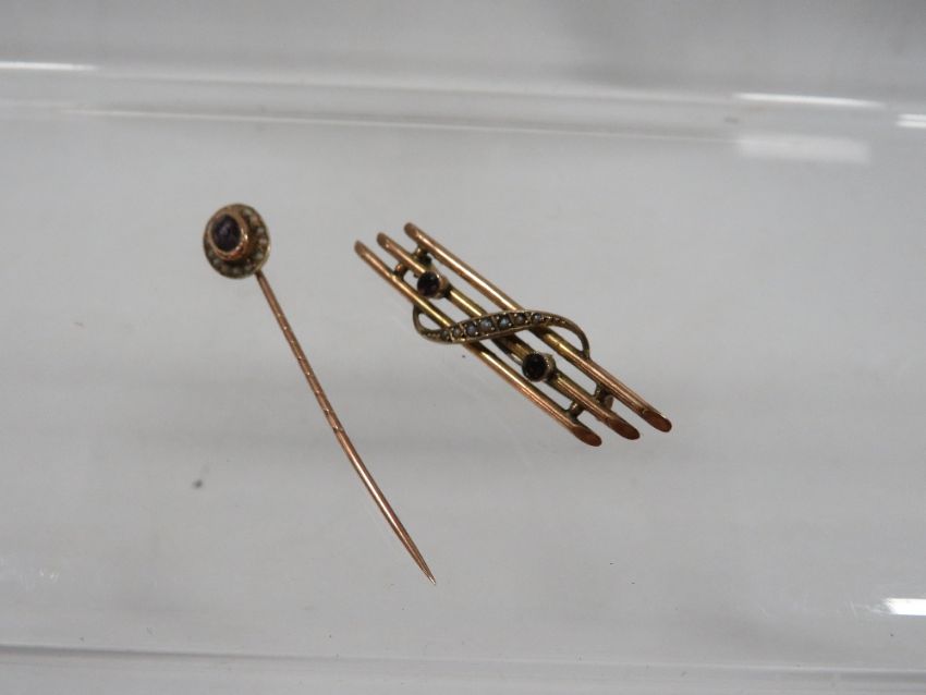 A 9ct amethyst and mother of pearl three bar brooch approx. weight 2.4g together with a 9ct amethyst and seed pearl stick pin