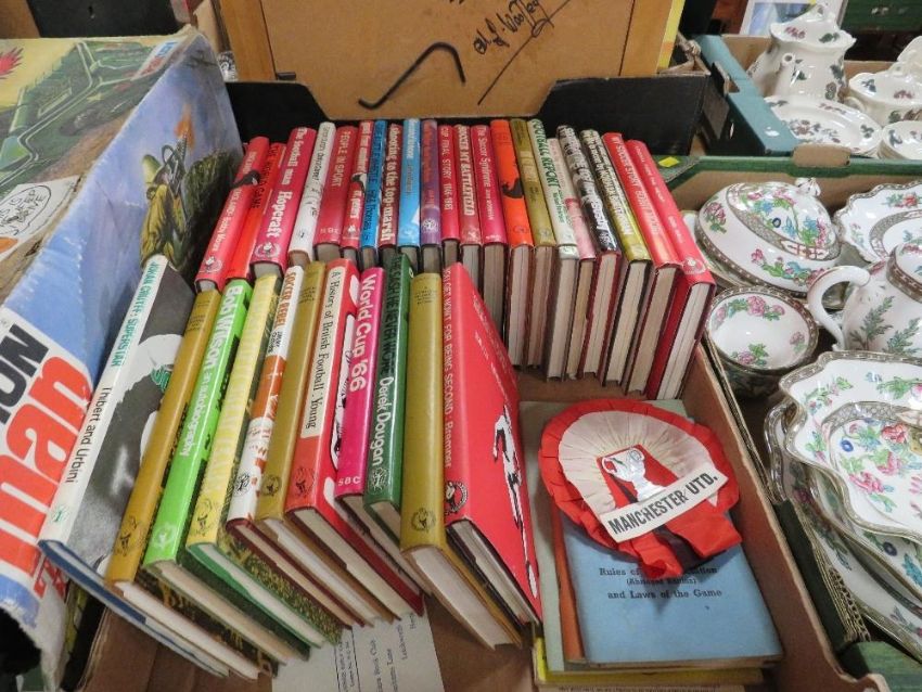 A collection of mainly 1970s vintage 'The Sportmans Book Club' football associated hardback books, together with Football Association handbooks 63 / 64 and 71/72, supplement 59/60, FA Yearbook 61/62, referees chart 1958 and a vintage Manchester United rosette.