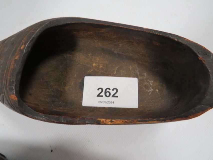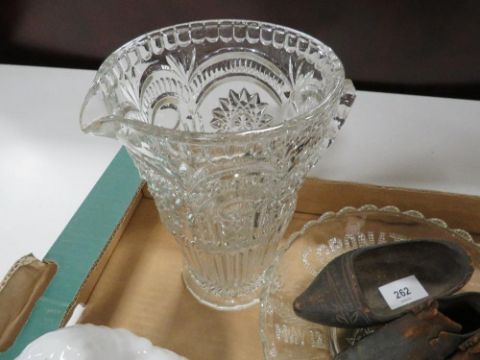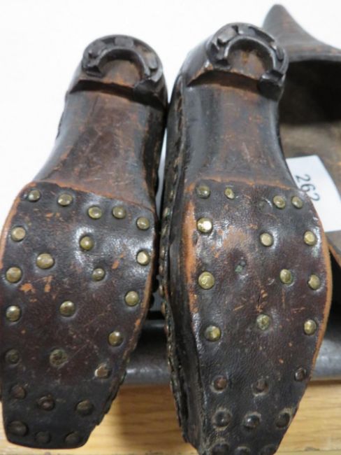 A pair of antique child's hob nail shoes together with a tray of assorted ceramics and glass