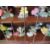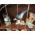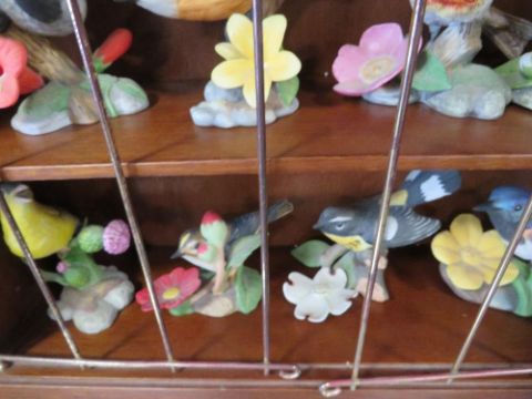 A display stand in the form of a bird cage containing 11 ceramic bird figures