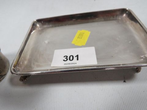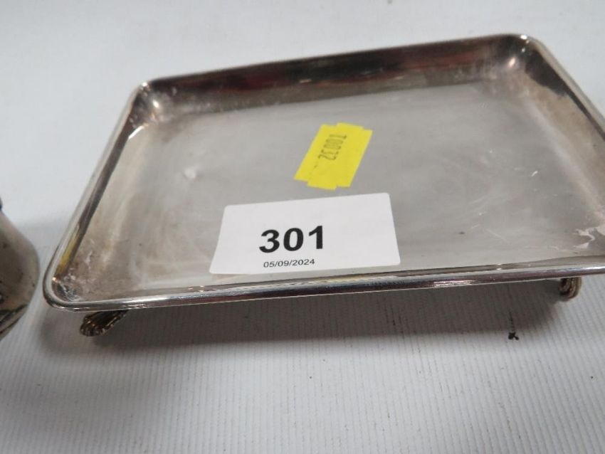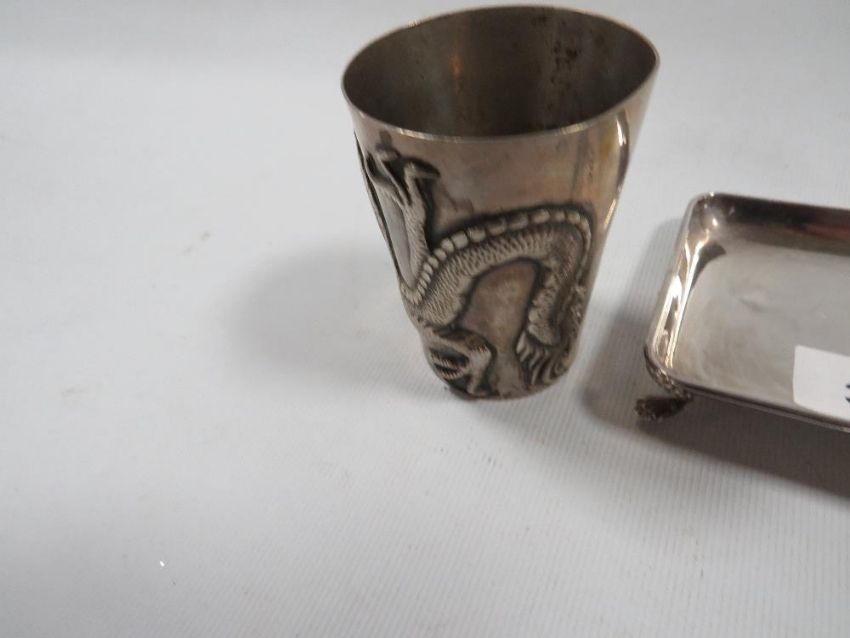 A continental white metal cup decorated with a three toed dragon with character marks to base together with a similar silver plated matchbox holder stamped Tuck Chang and a hallmarked silver pin dish Approx. 60.7g
