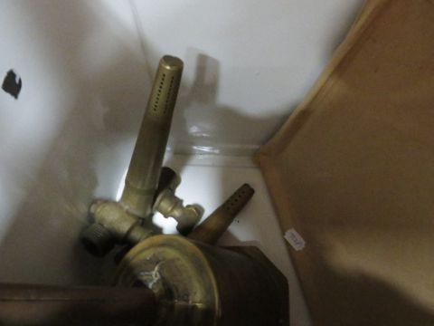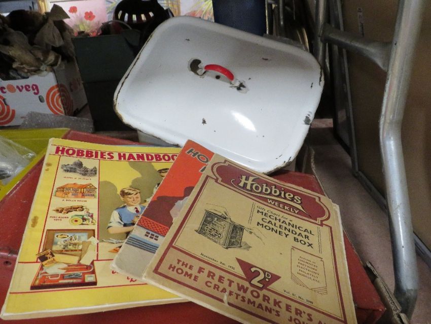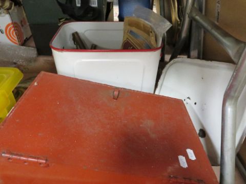 An enamel bread bin, lockable enamelled metal box, brass beer taps etc
