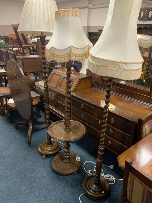 Two vintage oak barley twist standard lamps together with a bobbin twist example (3)