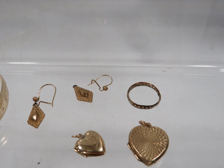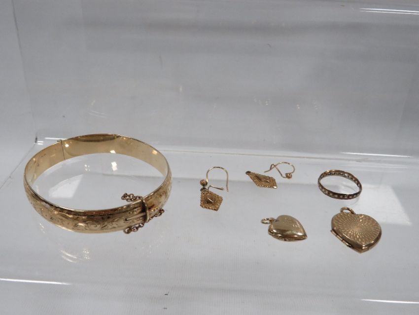 A bag of yellow plated metal jewellery to include a gold plated metal core bangle, lockets etc