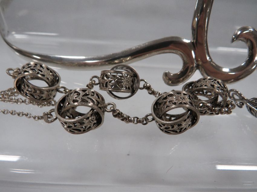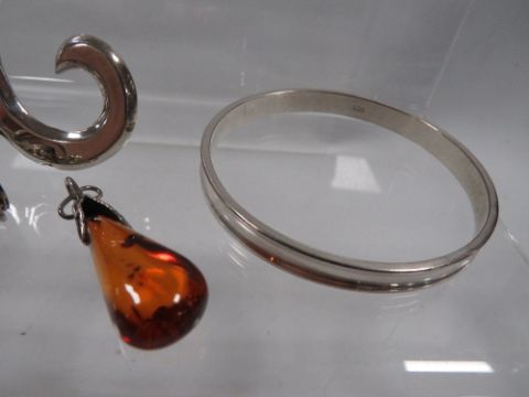 A silver collarette, bangle, bracelet and amber pendant (4)