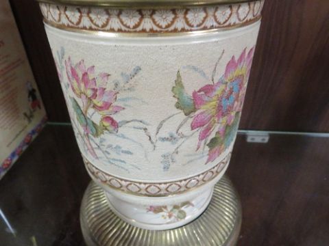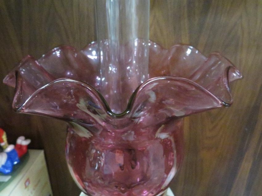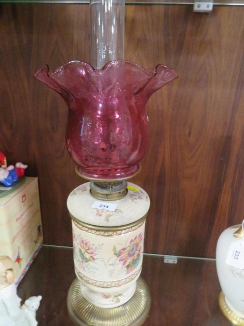 A vintage ceramic oil lamp with cranberry style shade -top loose