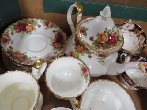 A tray of assorted tea ware to include Royal Albert old country roses