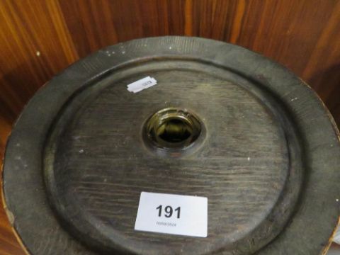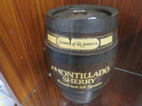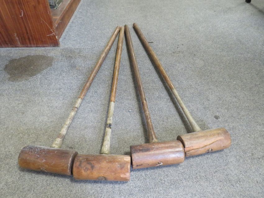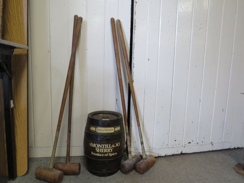 A set of 4 vintage croquet mallets and wooden sherry barrel