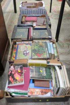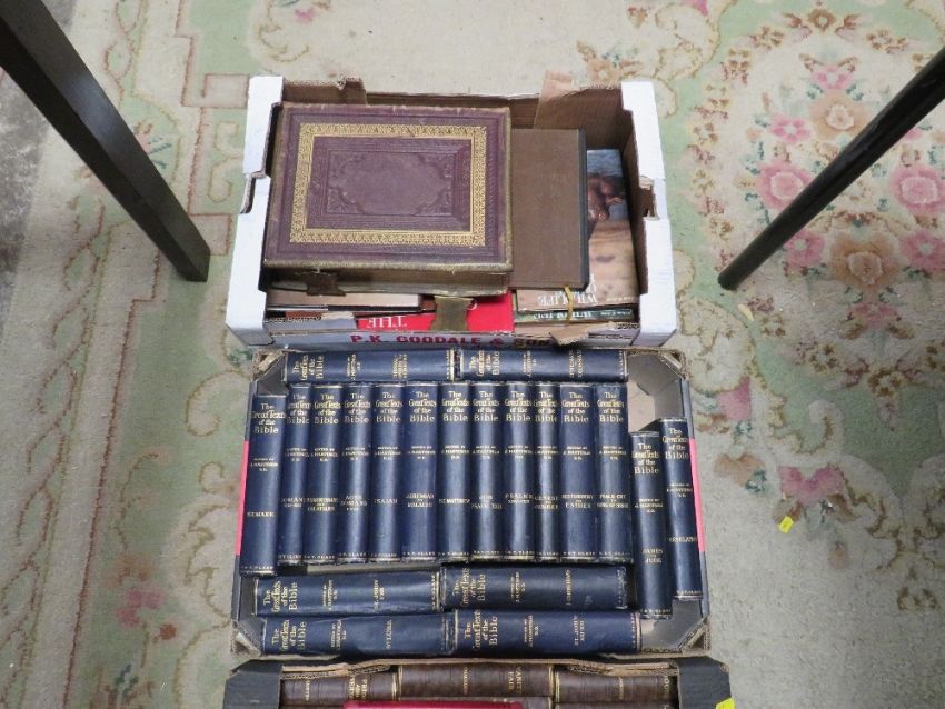 Six trays of assorted books to include Hutchinson's Beautiful Britain, family bible etc