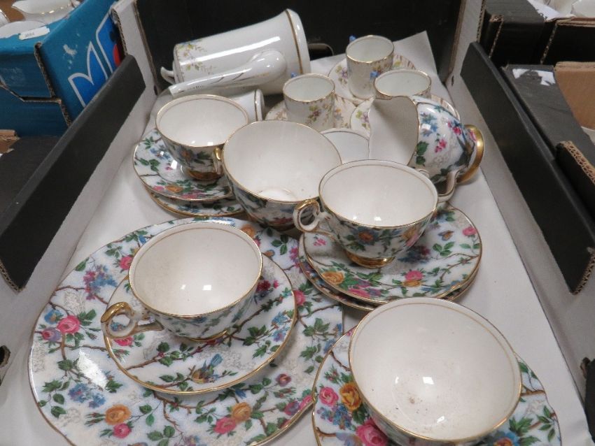 Four trays of assorted tea ware to include Aynsley, Paragon etc