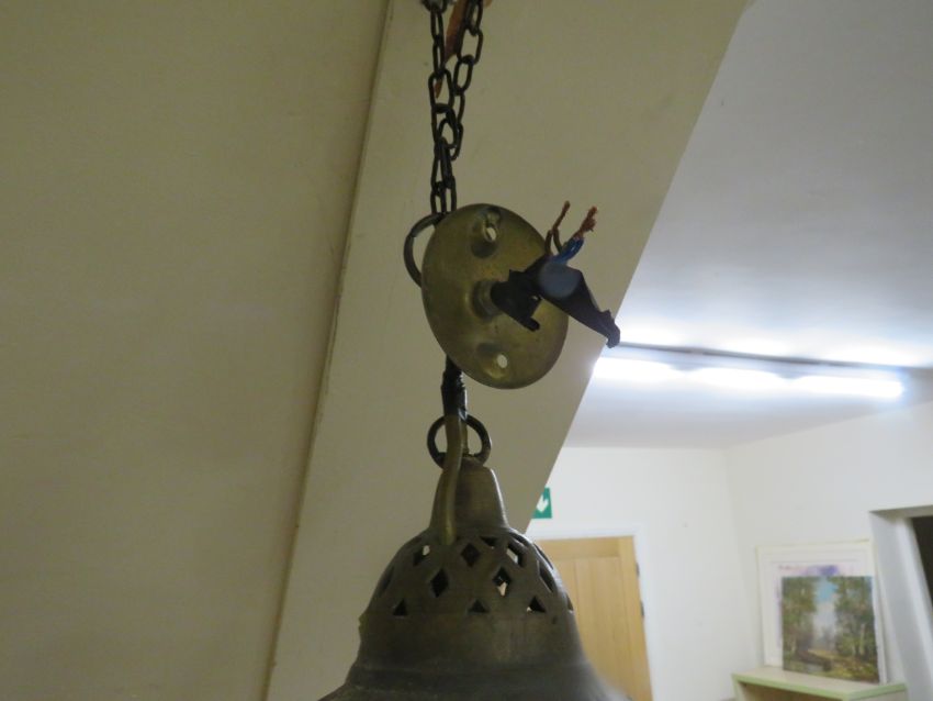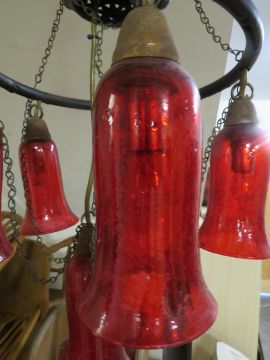 An unusual Moroccan style ceiling chandelier / light fitting with red glass shades (two loose in office)