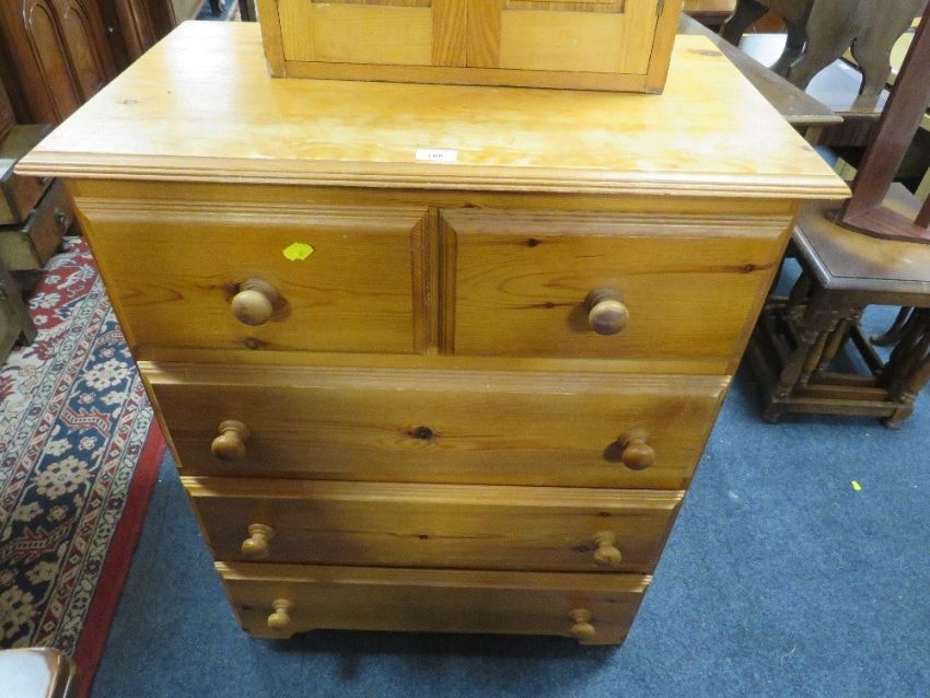 A honey pine five drawer chest together with a two door light oak cabinet. (2)