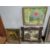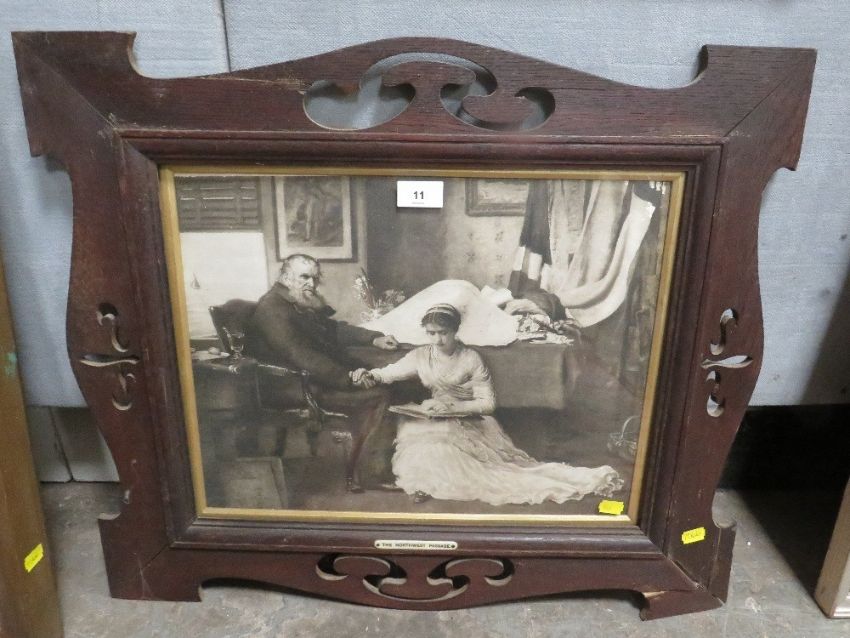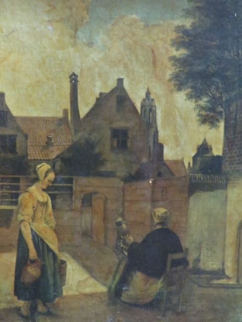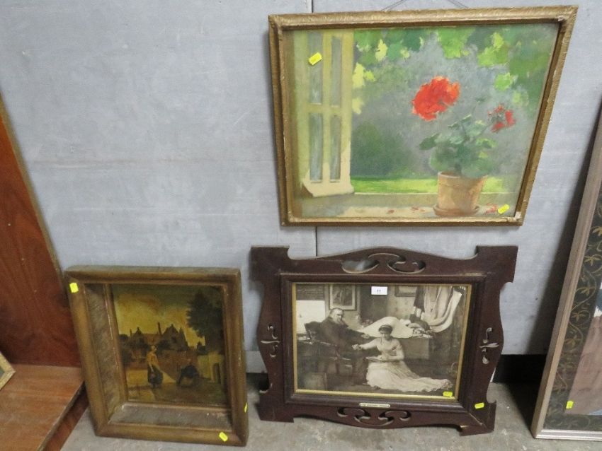 An Art Nouveau oak picture frame together with a still life floral painting, and Dutch style naïve picture (3)