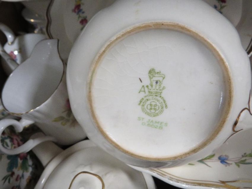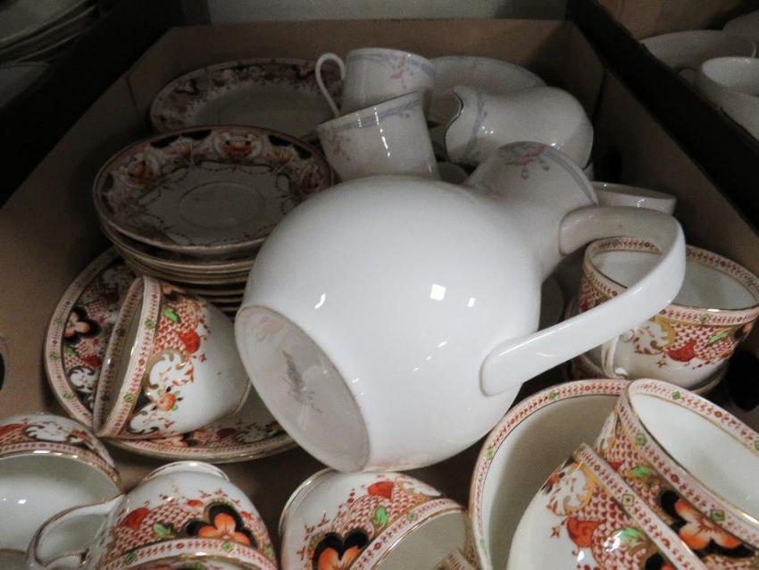 Five trays of assorted ceramics to include tea/dinner ware to include two Royal Worcester Figurines "Autumn Song" and "Serenity