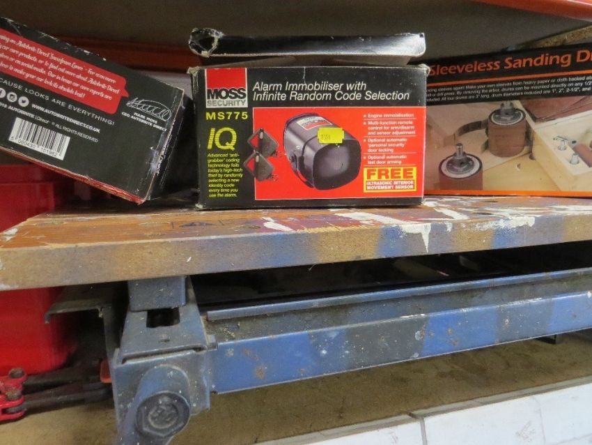 A large selection of tools and related items to include saws, stand, Black & Decker workmate and boxed car alarm