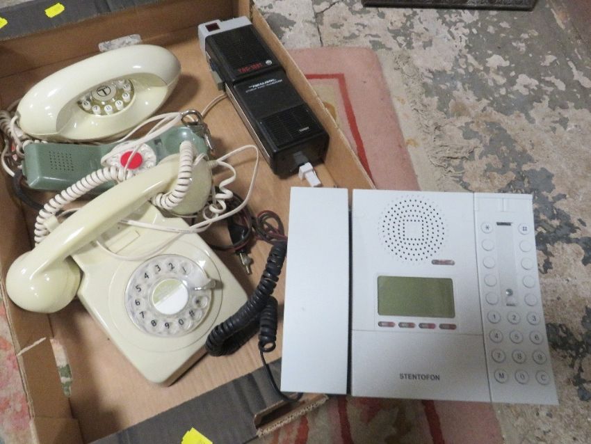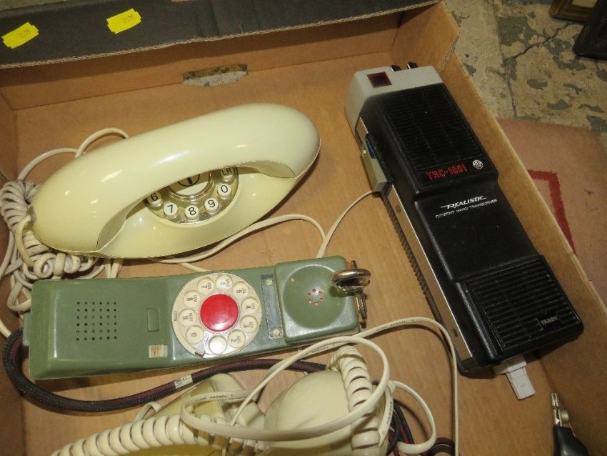 A tray of vintage telephones to include a modern Stentofon by Jacob Jensen and a realistic hand held CB radio