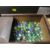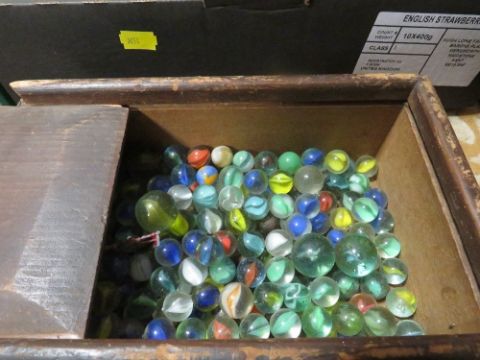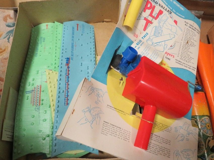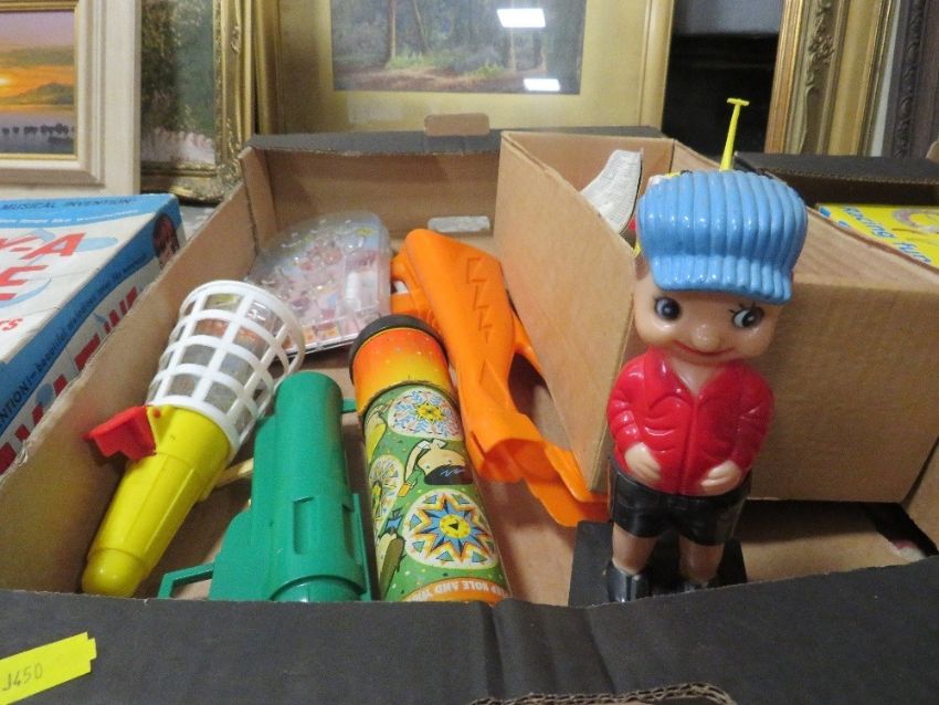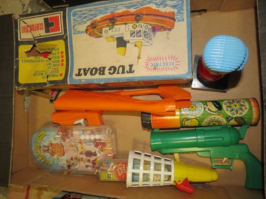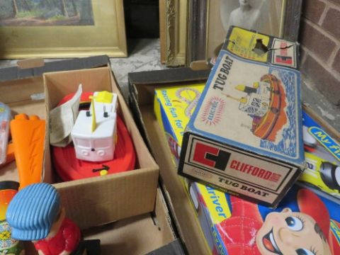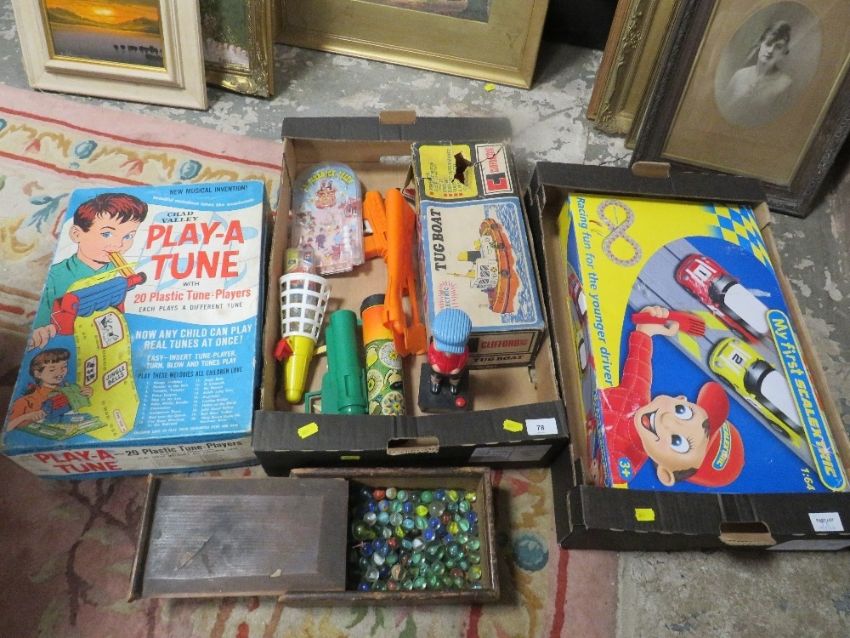 Two trays of vintage toys to include tug boat, marbles, Chad Valley Play a Tune, Scalextric etc