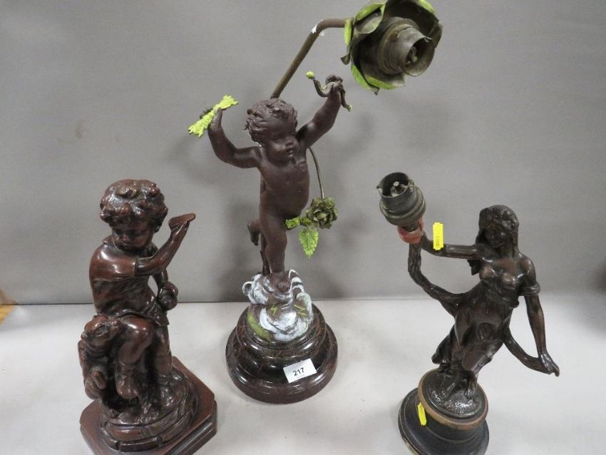 A cast metal cherubic lamp A/F together with a bronze effect lamp base and a cast metal figural lamp (3)