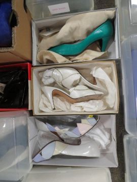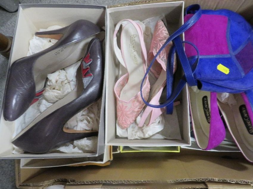 A large quantity of ladies shoes to include Roland Cartier, Sorina, Carvela and a couple of matching handbags
