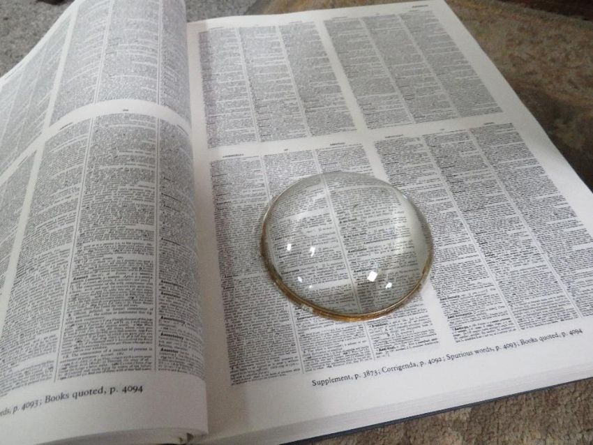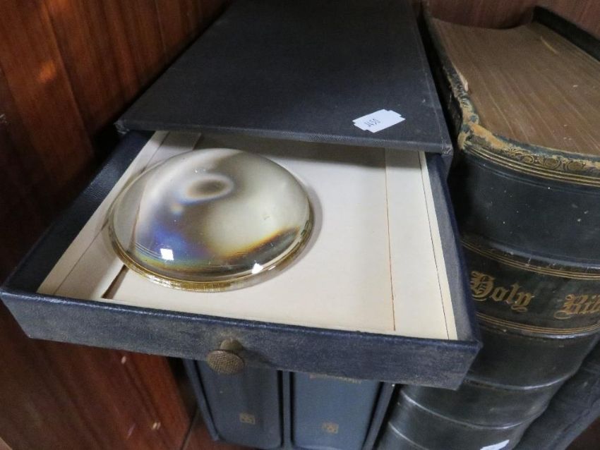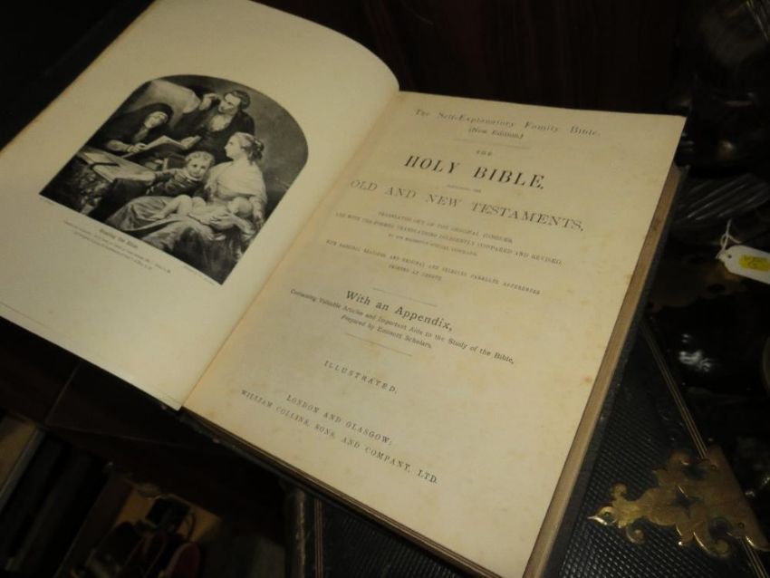 A large family devotional bible by the Rev. Matthew Henry, with clasp, together with a similar sized bible and the compact edition of the Oxford dictionary