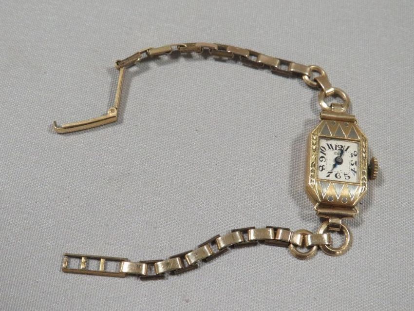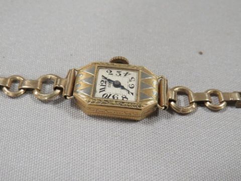 A hallmarked 18k gold wrist watch on a gold plated bracelet