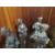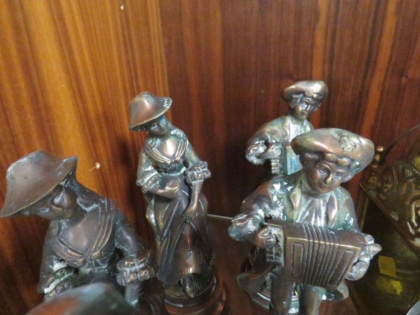 A brass mantel clock together with six cast metal figures